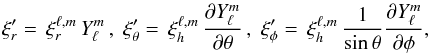 Projection onto the spherical harmonics is thus performed in the limit of low rotation. For one normal mode of a given m and ℓ, the eigen-displacement and velocity can be decomposed such as (A.15)where (Rieutord 1987)