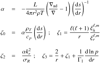 We assume that the perturbations consist in non-radial oscillations and that they behave linearly as exp[i(σt + mφ)], where σ is the modal frequency, t the time, and m the azimuthal degree. Consequently, for a given quantity f, its perturbation can be written (A.1)where a is the amplitude, σR the real part of the frequency σ, and ℛe stands for the real value. From Eq. (A.1) one immediately deduces a relation for squared quantities that reads