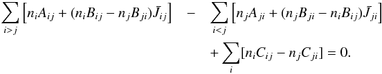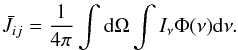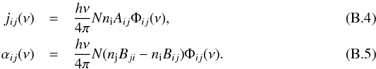 Finally, to describe the full line radiative transfer problem, a set of balance equations is needed: (B.9)In fact, Eq. (B.9) is not one single equation, but a whole set of linear equations, one for every energy level. In our code this linear matrix equation is solved with a simple Gaussian elimination algorithm. This set has to be solved locally (for every grid cell), but it has a global character due to its dependency on the line integrated mean intensity