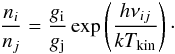 In this assumption the level populations follow a Boltzmann distribution and the excitation temperature of the selected transition is assumed to be equal to the kinetic temperature Texc = Tkin: (B.11)Here gi and gj are the statistical weights of the i − j line transition and νij the corresponding central frequency.