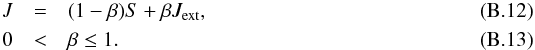In the case of protoplanetary disks, the radial velocity gradients are usually much larger than the local thermal and microturbulent velocities (Weiß et al. 2005; Castro-Carrizo et al. 2007). This means that photons emitted at a certain disk region can only interact and consequently get absorbed locally. In this approach, the mean intensity J is approximated from the local source function S in combination with an external radiation field Jext: The quantity β gives the probability of a photon beeing able to escaping the model. We note that in the optically thin case a photon can escape the model without interaction. For this case, β equals 1 and the LVG method would be equal to the full escape probability method. Therefore, the FEP method (also included in Mol3D) uses the same formalism as the LVG method, but with β always set to 1 (see also van der Tak et al. 2007). To calculate the local β, our program uses Eq. (B.14) introduced by Mihalas et al. (1978); de Jong et al. (1980) for accretion disks in general,