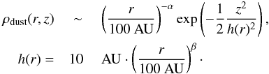 In Sect. 2 we introduced the different methods of calculating level populations implemented in Mol3D. In Fig. B.1 we present the spectrum of the HCO+ (4−3) transition of a typical protoplanetary disk (Mdisk = 0.07 M⊙), comparing the different methods assuming a uniform N(HCO+)/N(H) ratio of 1 × 10-8. For simplicity, we choose a flared disk model around a T Tauri star utilizing a temperature distribution with a gradient in radial and vertical direction and a power-law model for the density distribution adapted from Shakura & Sunyaev (1973): (B.16)The disk is orientated face-on. We assume pure Keplerian rotation and neglect dust re-emission. All spectra are normalized to the maximum value of the LTE solution. To allow comparison, the resulting spectra obtained with the URAN(IA) code are also included.