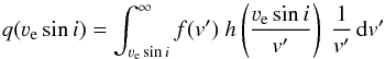 The PDF of the projected rotational velocity, q(νesini), is obtained by convolving the intrinsic rotational velocity PDF with the sini distribution in the following way: (A.2)where f is as defined in Eq. (2), and h can be either of the two sini PDFs discussed above. The likelihood of an individual νesini measurement given the above model and a measurement uncertainty σv is then obtained by the convolution of the above PDF and a Gaussian distribution (assuming normally distributed errors):