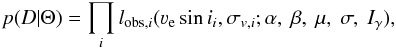 We are interested in the posterior probability density function of the model parameters (Θ = {α,β,μ,σ,Iγ}) given the data (D: a set of νesini measurements with associated uncertainties σv). In a Bayesian framework, the posterior probability density can be written as: (A.4)where p(D | Θ) is the likelihood function and p(Θ) is the prior distribution. The normalization Z = p(D) is independent of Θ for a given choice of the form of the generative model, so for the problem that we are interested in here, we can simply sample from p(Θ | D) without computing Z. Our likelihood function is simply the product of individual likelihoods as given by Eq. (A.3), i.e.,