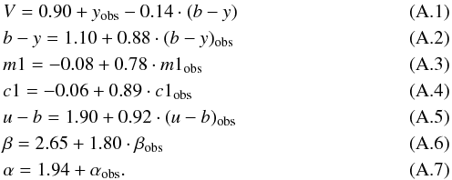 The transformation equations are based on the calibration of Crawford & Barnes (1970) and we followed the recipe from Balog et al. (2001). Its four zero-point constants refer to the slopes for (b−y), m1, c1 and β, respectively, while the three color-term coefficients are for V, m1 and c1. The WiFSIP field of view contained eight standard stars from the compilation of Hauck & Mermilliod (1998) and six of them could be used to determine the zero points. However, all of these stars are brighter than 9th magnitude in V and are thus close to the saturation limit of our CCD. Therefore, the standard deviations between the literature values and the WiFSIP instrumental values are comparablylarge, ± 0.012 for (b−y), ±0.07 for c1, ±0.04 for m1 and ±0.19 for β, and are not representative for the photometric precision. The (b−y) color term in the equations for m1 and c1 was too uncertain and was set to zero. A.1The final WiFSIP Strömgren and Hα indices for the CoRoT stars are listed in Table A.2.