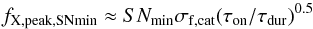 The minimum flare peak flux detectable above a signal-to-noise threshold of SNmin is: (B.1)where σf,cat is the EPIC total-band flux error in the 2XMM catalogue (i.e. column ep_8_flux_err), τon is the observation duration (“on-time”), τdur is the flare duration, and S:N is evaluated over the time interval τdur (Sect. 3.1).