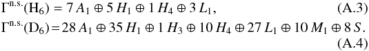 (A.2)where I is the nuclear spin (1/2 for H and 1 for D), n the number of identical nuclei (here 6), and x the number of transpositions or pairwise permutations, which correspond to the operation R. The number of interchanges corresponding to a cyclic permutation of k elements is k − 1, and so x = k − 1. For example, x = 2 for the ternary permutation (123). The character table of S6 is easily obtainable using GAP (2015). By applying the orthogonality relation of the characters of irreducible representations, we derive the following decompositions for the symmetry representations of H6 and D6:
