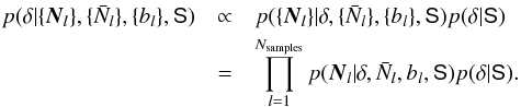 We write the conditional probability for the underlying density field δ as (B.1)To write the last line we use the property that the number counts of different samples l are conditionally independent but depend on the common underlying density field.