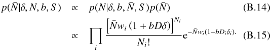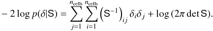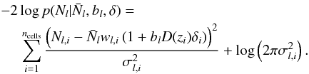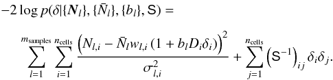 For clarity we now explicitly index the cells with subscript i. We adopt a Gaussian model for the number counts and write the log of the likelihood log p ∝ χ2 as (B.2)The variance of counts is generalised as