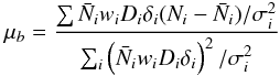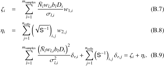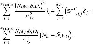 (B.6)where we consider cell i and the sum is over galaxy samples indexed by l. The subsamples are being weighted by their relative biases bl. This form of weighting for the density field was derived by Cai et al. (2011) and is optimal in the case of Poisson sampling but also matches the weights for the power spectrum (Percival et al. 2004).