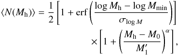 (A.2)which describes the mean number of halos within a parent halo of mass Mh (Zehavi et al. 2011).