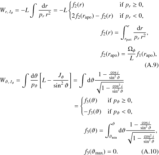 (A.2)where we integrate over the particles trajectory in phase space, which means for example that during a whole radial period, the particle transverses twice the branch from pericentre to apocentre, but once in reversed direction. The latitudinal momentum pϑ is