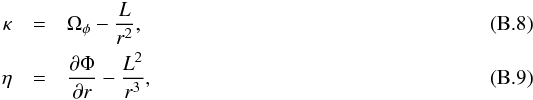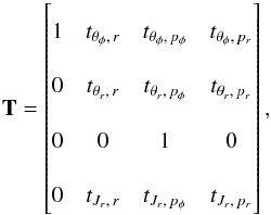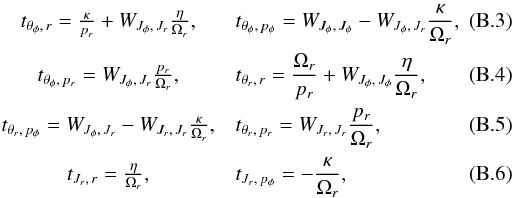 The linearised transformation between action-angle coordinates and Cartesian coordinates is (B.1)For simplicity, we provide here the matrix for the 2D case (i.e. when the orbit is in the plane). In that case, Jθ = 0 and Jφ = L = Lz, so that we find